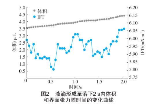 圖2為40℃、6.5 MPa時,液滴形成至落下的2 s內液滴體積和測得的界面張力隨時間的變化。由圖2可看出,在落下過程中體積逐漸變大,界面張力誤差在0.3 mN/m之內,雖然浮動不是很大,但任取一點不能較好地體現整體。因此,選擇在懸滴完全形成開始計算,到完全落下以幀為間隔,因為液滴完全形成時可以較清晰地得到液滴的最大曲率半徑,批量計算這段時間內的界面張力值,最后得到其平均值。為避免液滴的隨機性,在每種環境下選取3個連續滴落的液滴的平均界面張力值作為最終結果。減少了實驗的偶然性,使得到的結果更加可信。