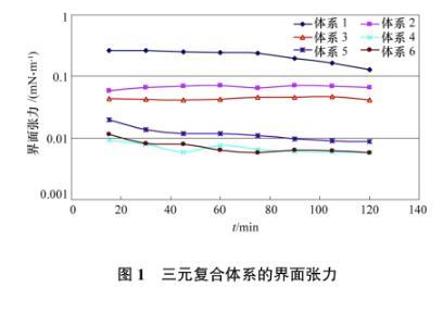 體系1、體系2、體系3可以構成界面張力不同而界面擴張黏彈性相同的對比實驗;體系4、體系5、體系6可以構成界面張力相同而界面擴張黏彈性不同的對比實驗。