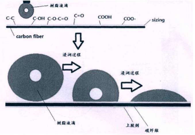 樹脂對(duì)碳纖維表面的浸潤性影響因素有很多。碳纖維表面的比表面積的大小,碳纖維表面的溝槽結(jié)構(gòu)或纖維表面的活性基團(tuán)的數(shù)量和種類,均對(duì)碳纖維的浸潤性有影響。