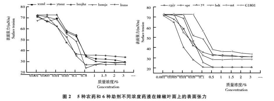 從圖2看出,隨著藥液濃度增加,5種農藥和6種助劑藥液在辣椒葉面上的表面張力呈逐漸減小趨勢。