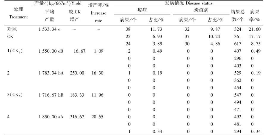 從表3看出,各處理與對照的產量、發病情況均存在差異。