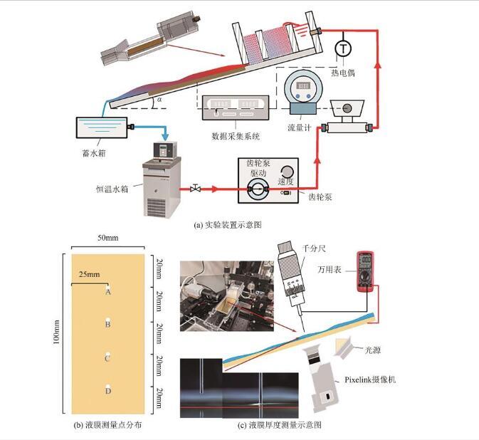 本實(shí)驗(yàn)的實(shí)驗(yàn)裝置,如圖3(a)所示。該裝置主要由液體回路、布液器和實(shí)驗(yàn)段三大部分組成。液體回路用于提供不同的流動(dòng)條件,以確保布液器能夠穩(wěn)定形成液膜。在這個(gè)回路中,液體從恒溫水箱(Julabo-Vivo RT2)中流出,恒溫水箱提供一個(gè)穩(wěn)定的入口溫度,由齒輪泵(Cole-parmer)控制液體流量大小,液體再流入流量計(jì)(Micro motion 2700,精度為±0.05%),流量計(jì)監(jiān)測(cè)管道內(nèi)液體的質(zhì)量流量,在布液器的入口端放置一個(gè)T型熱電偶(精度為±0.5℃)來(lái)測(cè)量入口溫度的變化,最后使用數(shù)據(jù)采集器(Keithely 2700)采集流量計(jì)的質(zhì)量流量、熱電偶的溫度和加熱片的功率。本實(shí)驗(yàn)對(duì)入口溫度要求較高,所以采用一些保溫措施,在不銹鋼管和布液器腔室周?chē)粚颖孛?,減少熱量損失。