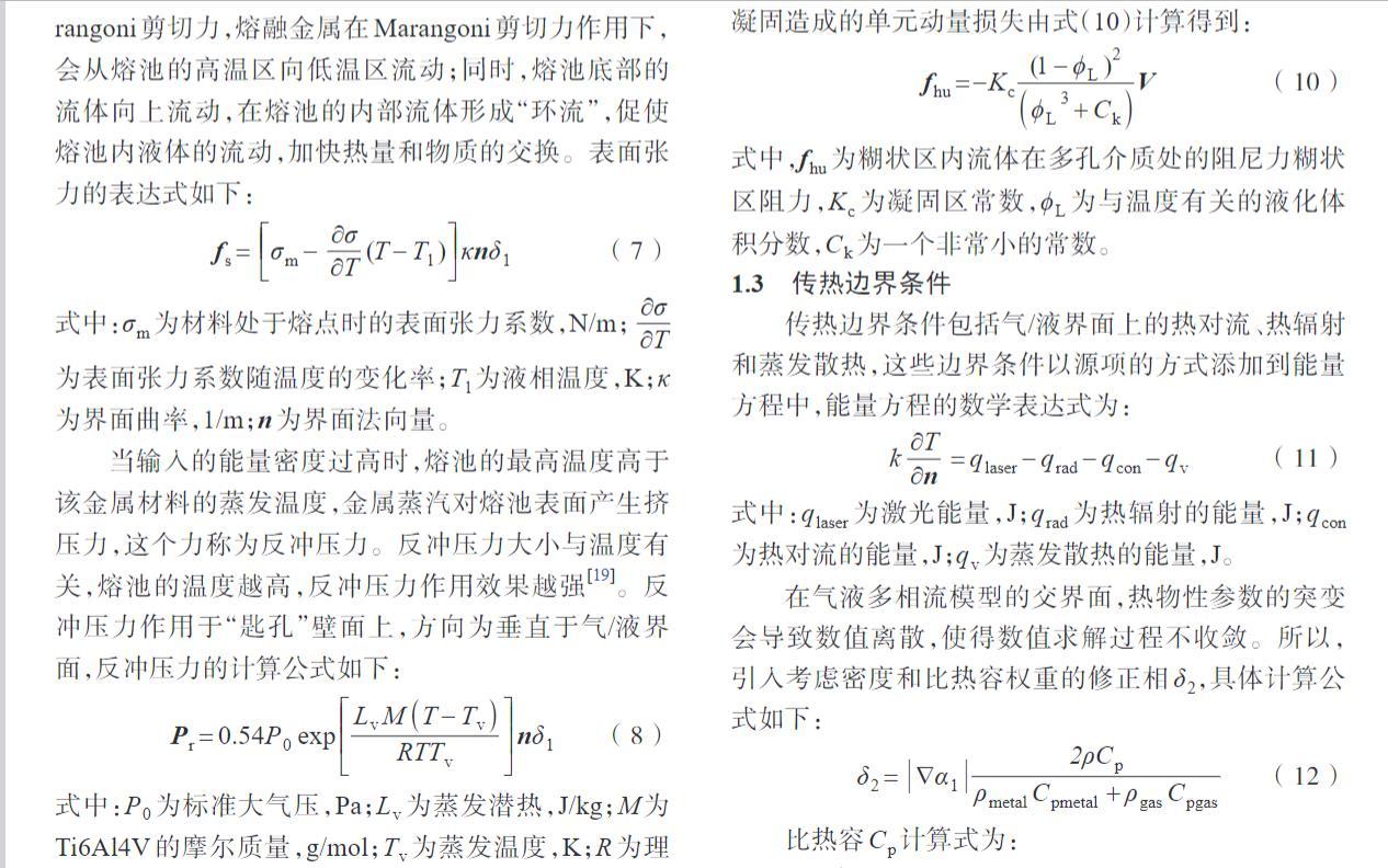 當輸入的能量密度過高時,熔池的最高溫度高于該金屬材料的蒸發(fā)溫度,金屬蒸汽對熔池表面產(chǎn)生擠壓力,這個力稱為反沖壓力。反沖壓力大小與溫度有關,熔池的溫度越高,反沖壓力作用效果越強。反沖壓力作用于“匙孔”壁面上,方向為垂直于氣/液界面,反沖壓力的計算公式如下: