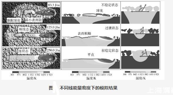 為分析線能量密度對球化缺陷形成機理的影響,選取激光功率150 W,線能量密度分別為83.3 J/m、125.0 J/m和250.0 J/m的3組參數(shù)進行數(shù)值模擬,結果如圖2所示。當線能量密度為83.3 J/m時,部分熔融金屬凝固并與周圍粉末黏附成球;部分熔融金屬在表面張力的驅使下傾向于減少表面能,迅速地成球;這兩種成球方式往往共同出現(xiàn)。這是因為激光的穿透深度沒有到達基板,此時接觸角為180°,呈現(xiàn)不完全濕潤狀態(tài),液態(tài)金屬流動受阻,因此不能在基板上鋪展。當線能量密度提高到125.0 J/m時,單道由球化形態(tài)向斷續(xù)態(tài)過渡,雖然表面還比較粗糙,但是球化效應明顯減弱,此時激光穿透深度剛剛到達基板,接觸角約為90°。當線能量密度繼續(xù)提高到250.0 J/m時,熔化的金屬粉末形成充足的熔融金屬,從而改善其流動性,凝固后獲得高度均勻和連續(xù)的單道,激光穿透深度能夠穿透粉末床并熔化基板,并且接觸角大于90°。因此,球化缺陷的形成機理可以總結為能量密度太低,熔融金屬不能在基板上鋪展。判斷是否球化最直接的依據(jù)是觀察熔池深度是否穿透粉末層厚,并熔化了基板,也可以計算熔池的接觸角是否小于90°來判斷熔池的濕潤性。此外,還可通過適當提高線能量密度,提高熔融金屬的流動性,以獲得更均勻和連續(xù)的單道。