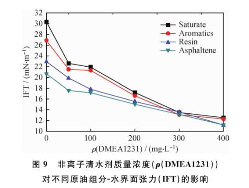 圖9非離子清水劑質量濃度(ρ(DMEA1231))對不同原油組分-水界面張力(IFT)的影響