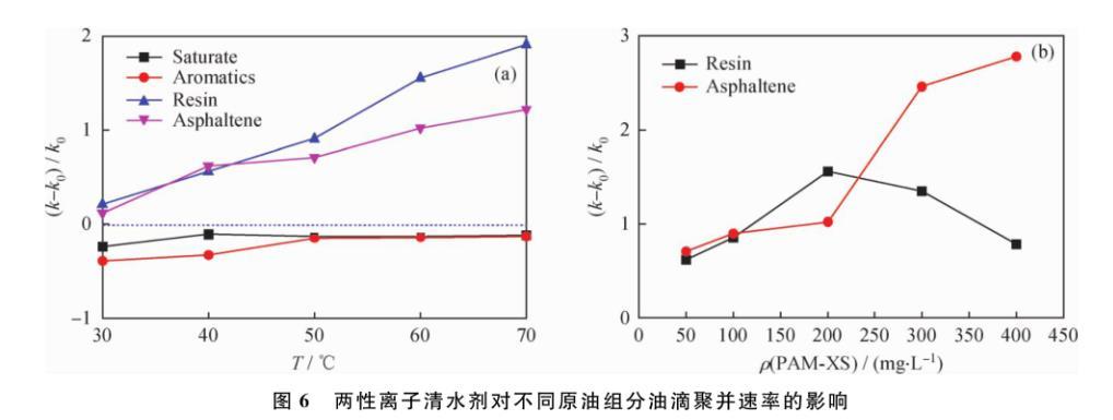 圖6兩性離子清水劑對不同原油組分油滴聚并速率的影響