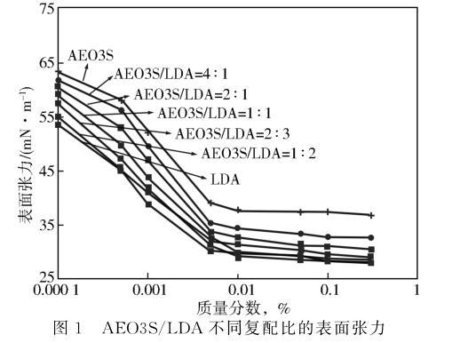 在25℃測試了AEO3S和烷醇酰胺LDA表面活性劑及其在不同質(zhì)量配比下溶液的表面張力,實驗結果見圖1。根據(jù)相對分子質(zhì)量計算出表面活性劑AEO3S的摩爾分數(shù)(αAEO3S)。由圖1中濃度與表面張力的關系得到溶液的CMC及對應濃度下的表面張力,實驗結果見表1。