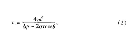 表示。式中,σ為表/界面張力,r為孔隙平均半徑,θ為潤濕角。因此,對于特定的儲層,破膠液表/界面張力越低且與巖石接近中性潤濕則返排能力越強。同時,根據Poiseulle方程,當返排壓差為Δp時,從半徑為r、長為l的毛細管中排出黏度為η、表/界面張力為σ和接觸角為θ的液體所需時間