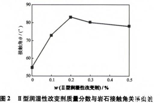 圖2為Ⅱ型潤濕性改變劑質量分數與巖石的接觸角之間的關系。從圖2可以看出,隨著Ⅱ型潤濕性改變劑質量分數的增加,接觸角由55°逐漸增大,當加入0.2%Ⅱ型潤濕性改變劑時接觸角可達到83°,繼續增加濃度接觸角略有減小,但都大于75°。