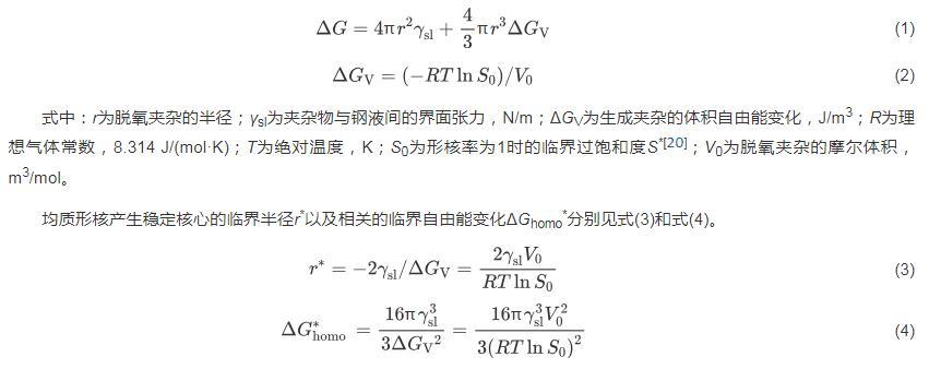 均質形核產生穩定核心的臨界半徑r*以及相關的臨界自由能變化ΔGhomo*分別見式(3)和式(4)。