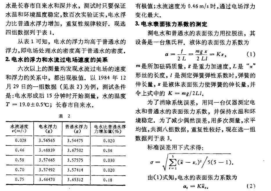 用自制電水器形成電水,用精度為0.1mg的電光天平測定電水和普通水的浮力。實驗用水是長春市自來水和深井水,測試時只要保證水溫和環境溫度穩定,數百次實驗證實,電水浮力比普通水浮力增加,重復性規律較好。現選四組數據列于表1。