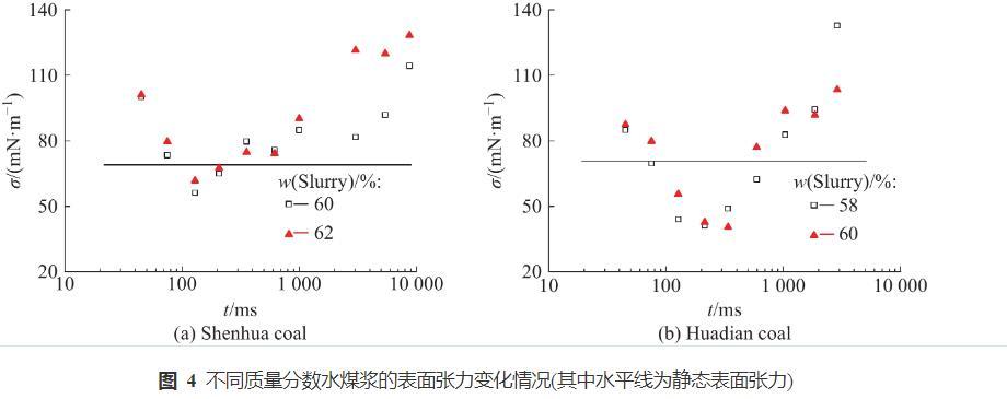 不同質量分數水煤漿表面張力的變化情況如圖4所示。可以看出:不同條件下水煤漿的動態表面張力變化情況比較一致,隨著特征氣泡時間(t)的增加,動態表面張力均先減小后增加,在氣泡特征時間為200 ms附近出現最小值;而水煤漿的動態表面張力與靜態表面張力存在顯著差異,在氣泡特征時間較小或較大時,動態表面張力均大于靜態表面張力。