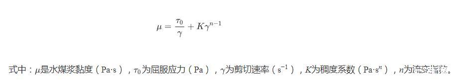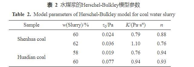式中:是水煤漿黏度(Pa·s),為屈服應力(Pa),為剪切速率(s?1),K為稠度系數(Pa·sn),n為流變指數。擬合關系式相關系數為0.98,擬合參數見表2。
