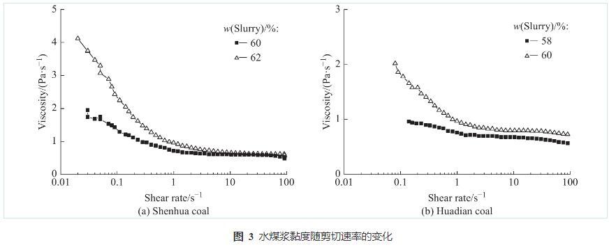 黏度、屈服應力等水煤漿的流變特性對漿體破裂過程有重要影響。在水煤漿中,煤粉顆粒、分散劑和水形成了相對穩定的三維空間結構,此時未被吸附、未參與形成緊密水化膜的自由水分布在這種三維結構的空隙中。這種空間結構在遭受剪切時很容易被破壞,從而導致分布在三維空間結構空隙中的自由水被釋放,黏度降低;同時,剪切應力越大,水煤漿的黏度越小,所以水煤漿一般為剪切變稀的假塑性流體。