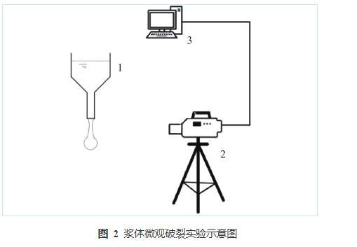 水煤漿的流變特性采用Bohlin CVO型馬爾文旋轉流變儀測量。表面張力的測量方法主要有吊片法、液滴-鼓泡法以及微觀界面面積測量法等。本實驗基于液滴-鼓泡法使用SITA science line t100型全自動表面張力儀對煤漿的動態表面張力進行了測量,并與芬蘭Kibron公司生產的Delta-8全自動高通量表面張力儀的靜態表面張力進行比較。采用液滴-鼓泡法測量動態表面張力時,將特制毛細管伸入待測液體,空氣經由毛細管進入液體,毛細管出口氣泡形成外凸,氣泡的半徑也隨之連續不斷減小。氣泡在液體中受到表面張力的擠壓,氣泡半徑越小,壓力就越大,然后通過測量壓力的變化獲得表面張力。測量動態表面張力時,通過控制空氣進入毛細管的流量來改變氣泡半徑變化速率,其涉及的特征氣泡時間也稱氣泡壽命,是指在鼓泡過程中從氣泡形成外凸到氣泡半徑達到最小值的時間間隔。水煤漿破裂實驗中,漿體通過噴嘴滴出,噴嘴內徑為4.18 mm。使用Photron Fastcam SA2型高速相機拍攝水煤漿破裂過程,并使用開源軟件ImageJ分析處理得到的圖片。漿體微觀破裂實驗示意圖如圖2所示。