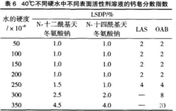 鈣皂分散的混合膠束機理認為,一個有效的鈣皂分散劑分子結構中必須包含一個大的極性親水頭基,這種“大”除了強度大外,也指體積龐大,這樣才能將肥皂分子有效隔開,使之不易形成鈣皂。N-十酰基天冬氨酸鈉和N-十四酰基天冬氨酸鈉都具有類似結構,而LAS及OAB并不具有類似結構。由表6可知,N-脂肪酰基天冬氨鈉具有優良的鈣皂分散性,N-十四?;於彼徕c更為突出,尤其是在高硬度水中,其鈣皂分散性能更為突出,說明其在硬水中具有良好的應用前景。