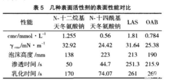 對N-十四?;於彼徕c鹽的幾項表面性能進行了測定,并與其他表面活性劑進行了對比,結果見表5。