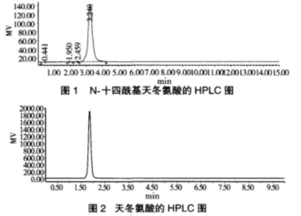圖1為提純后最終產品的HPLC圖,圖2為原料天冬氨酸的液相色譜圖,圖3為副產物棕櫚酸的液相色譜圖。