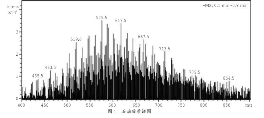 遼河原油石油酸的質(zhì)譜圖(見(jiàn)圖1),從圖1可以看出,石油酸相對(duì)分子質(zhì)量主要分布在400~900,且質(zhì)荷比大多數(shù)是奇數(shù),與石油酸根的相對(duì)分子質(zhì)量M=14n+45-2x相對(duì)應(yīng)。依據(jù)質(zhì)荷比計(jì)算石油酸的基本結(jié)構(gòu)信息,如:409對(duì)應(yīng)C27脂肪酸,407對(duì)應(yīng)C27單環(huán)烷酸,401對(duì)應(yīng)C27四環(huán)烷酸;605對(duì)應(yīng)C41脂肪酸,603對(duì)應(yīng)C41單環(huán)烷酸,601對(duì)應(yīng)C41雙環(huán)烷酸;599對(duì)應(yīng)C41三環(huán)烷酸,597對(duì)應(yīng)C41四環(huán)烷酸,595對(duì)應(yīng)C41五環(huán)烷酸,593對(duì)應(yīng)C41六環(huán)烷酸,591對(duì)應(yīng)C40脂肪酸;899對(duì)應(yīng)C62脂肪酸;可以確定遼河石油酸的碳數(shù)主要分布在C27~C62。對(duì)不同不飽和度的石油酸質(zhì)譜峰離子強(qiáng)度進(jìn)行歸一化,獲得不同類(lèi)型石油酸的相對(duì)含量(見(jiàn)表3),可以看出環(huán)烷酸含量為86.58%,脂肪酸含量為13.42%。