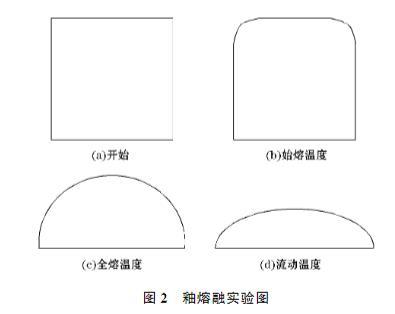 通過對釉料熔融實驗的觀察可以看到,隨著溫度升高,低共融物產生,試樣出現液相,逐漸變為熔體。四棱柱試樣最先變形的部位為頂部角點。由于角點是四棱柱曲率最大的部位(7/8的表面與空氣接觸),表面張力最大,表面能高,由表面張力產生的指向熔體內部的附加壓力也最大,因此角點最先熔融變圓,此時試樣所處的溫度(1180℃),稱為釉的始熔溫度,釉層開始封閉,如圖2b所示。隨著溫度繼續升高,四棱柱的棱邊也開始熔融變圓,棱邊也是曲率較大的部位(3/4的表面與空氣接觸)。最后,四棱體的各個平面開始熔融變圓(1/2的表面與空氣接觸),整個試樣由于表面張力的作用變為半球狀,此時的溫度(1260℃)稱為全熔溫度,如圖2c所示,形成平整、光滑的釉面。釉層雖然處于黏性流動狀態,但黏度較大不至于流淌,因此接近于釉的成熟溫度。溫度繼續升高,試樣流散開來,高度降至原有高度的1/3時的溫度(1300℃)稱為流動溫度,見圖2d。此時由于溫度升高,熔體表面張力減小,同時釉熔體黏度降低,受重力作用熔體會產生自然流淌,熔體表面由球面變為橢球面。