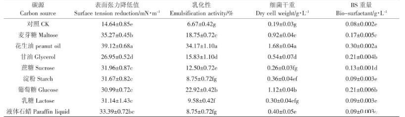 細胞表面的物質(zhì)合成需要氮源,氮源的種類會對細菌細胞的生長和發(fā)酵產(chǎn)物的產(chǎn)量產(chǎn)生很大影響。由表4可以看出,不同氮源對細菌發(fā)酵過程中表面張力降低值的影響較小,可能與發(fā)酵液中的生物表面活性劑含量已經(jīng)達臨界膠束濃度(CMC)有關。當?shù)礊榱蛩徜@時發(fā)酵液表面張力降低值最大,同時乳化性、細菌干重、糖脂含量均達到最大值。這與錢曉勇等研究結(jié)果一致,硫酸銨是促進生物表面活性劑生成的較好氮源。