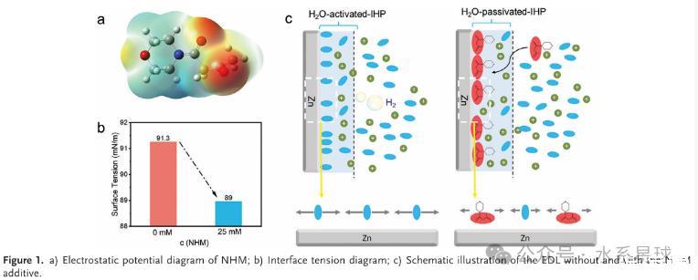 本研究探索了一種新型有機NHM添加劑,旨在增強陽極界面穩定性并改善鍍覆/剝離行為。通過降低界面張力,NHM添加劑重塑了電雙層(EDL),有效限制了鋅陽極與H?O之間的接觸,從而抑制了寄生反應。