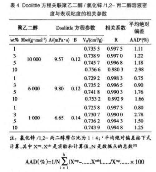 式中:A和B是常數,ρ是密度,V0是密堆體積。所關聯的結果列于表4中,包括A、B、V0相關系數和平均絕對偏差(AAD)。密度已經非常成功地被用于和粘度進行關聯。正如前人報道,聚乙二醇/氯化鋅/1,2-丙二醇溶液的表觀粘度隨密度增加而降低。表4中密堆體積在0.72~0.76 cm3/g的范圍內,并且分子量為10 000 g/mol、6 000 g/mol、1 000 g/mol聚乙二醇都顯示出隨聚乙二醇濃度增加而增加。聚乙二醇濃度相同時,密堆體積隨著分子量的增加而增加。