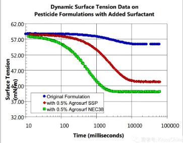 我們分別用Kibron動態表面張力儀,DSA100液滴形狀分析儀,從動態表面張力,接觸角和滾動角的角度,來全面衡量和評價0.5wt%的Agrosurf SSP、0.5wt%的Agrosurf NEC38對農藥的噴灑效果。