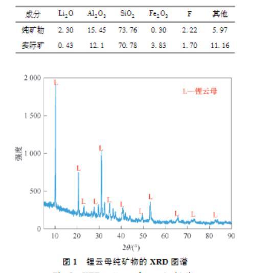 試驗所用鋰云母純礦物為購買的高純度礦塊,實際礦試驗所用鋰云母礦取自江西崇義,經破碎、磨礦、篩分等流程,得到粒級為(-0.074+0.045)mm的浮選試驗礦樣。鋰云母純礦物及實際礦多元素分析見表1,純礦物的XRD圖譜如圖1所示,可看出無明顯雜質峰。化學元素分析表明鋰云母純礦物含2.30%的Li?O,符合純礦物浮選要求。實際礦浮選試驗礦樣含0.43%的Li?O,屬于低品位難選鋰云母礦。