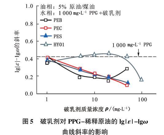 圖5破乳劑對(duì)PPG-稀釋原油的lg|ε|-lgω曲線斜率的影響