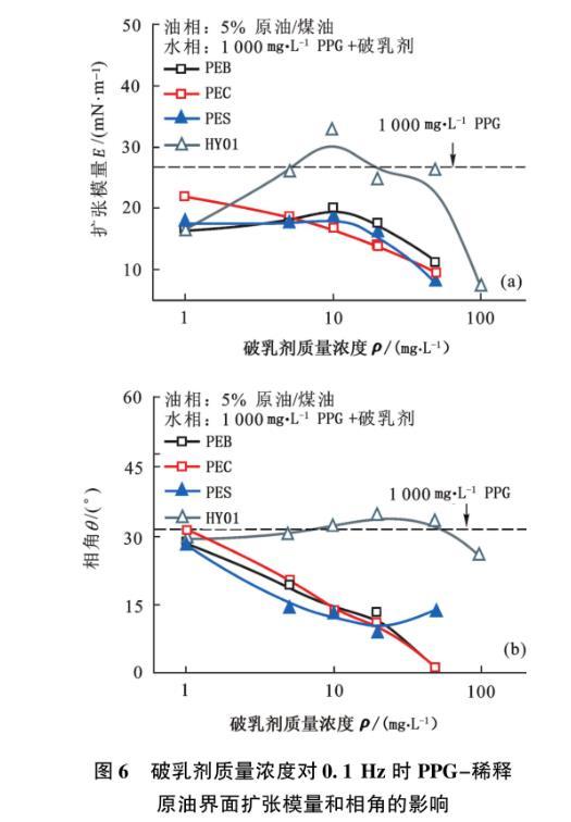 圖4不同頻率條件下PES對(duì)PPG-稀釋原油界面擴(kuò)張模量和相角的影響