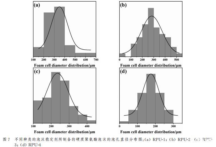 為了對聚氨酯泡沫孔徑大小和分布情況進(jìn)行量化,通過ImageJ軟件對SEM測試結(jié)果進(jìn)行處理分析,其孔徑分布直方圖如圖7所示。通過泡沫的孔徑分布直方圖對比結(jié)果可以看出,添加國產(chǎn)-1的聚氨酯泡沫孔徑分布范圍在100~700μm,存在較大直徑的泡孔,添加進(jìn)口-2的聚氨酯泡沫泡孔直徑分布范圍在0~550μm,雖然分布范圍有變窄,但也存在較大泡孔直徑,添加PAVE-5的聚氨酯泡沫泡孔直徑分布范圍在100~450μm,泡孔分布范圍減小,但仍然存在超過400μm的大泡孔,分布范圍最窄的是添加PGVF-6泡沫穩(wěn)定劑的硬質(zhì)聚氨酯泡沫,分布范圍在0~300μm,沒有超過400μm直徑的泡孔,泡沫泡孔直徑得以減小,泡沫泡孔細(xì)小均勻。這種微觀結(jié)構(gòu)上的改善可能得益于在發(fā)泡過程中,接枝APEG的POSS可以作為三維網(wǎng)絡(luò)結(jié)構(gòu)的交聯(lián)點,通過其與聚氨酯基體的相容性,親水性-OH基團(tuán)有助于形成更加穩(wěn)定的泡沫結(jié)構(gòu)。