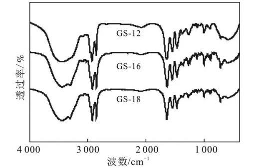 根據方案1的合成路線,成功制備了3種以1,4-二溴-2-丁烯為連接基團的酰胺基Gemini表面活性劑。利用紅外和核磁對酰胺基Gemini表面活性劑GS-12,GS-16,GS-18進行結構表征,結果見圖1和圖2。