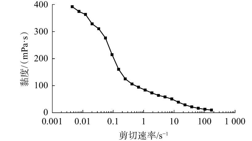 圖7為小段塞的黏度隨剪切速率的變化情況。從圖7可看出,體系黏度隨剪切速率的增加而快速降低,從392.8 mPa·s降至10.3 mPa·s。由于剪切力作用下纏結的自組裝超分子鏈打開并發生取向,導致表面活性劑的黏度整體上隨著剪切速率的上升而下降。在低剪切頻率下黏度下降明顯,屬于典型的“非牛頓流體”,但當剪切速率進一步增大時,黏度下降緩慢。