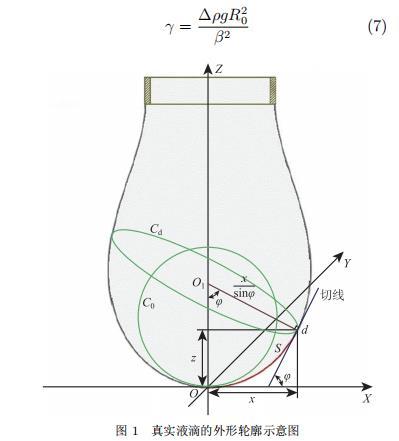 在 Young-Laplace 理論方程的基礎(chǔ)上,Bashforth 和 Adams 通過進一步推導(dǎo)得到了懸滴法和躺滴法的表面張力測量工作方程,懸滴法的測量工作方程主要基于兩個基本假設(shè):1) 懸垂液滴在重力和表面張力的共同作用下處于平衡狀態(tài);2) 懸垂液滴的形狀呈現(xiàn)完美的中心軸對稱。對處于平衡狀態(tài)的真實懸垂液滴,通過圖像處理軟件精準(zhǔn)提取液滴的外形輪廓,以液滴頂點為坐標(biāo)原點建立空間直角坐標(biāo)系,如圖 1 所示,則液滴輪廓 d 點應(yīng)滿足的關(guān)系式為: