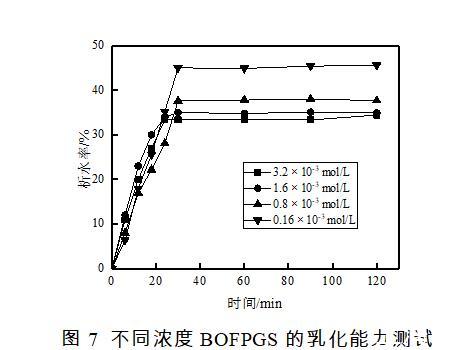 將同等體積的BOFPGS水溶液與液體石蠟混合均勻之后,在50℃恒溫中靜置觀察所形成的乳液析水情況,析水率越小說明乳化能力越強,形成的乳液越穩定。BOFPGS與液體石蠟形成乳液的析水率如圖7所示。從圖7可以看出,乳液隨著靜置時間增加,析水率增大,約在30 min以后乳液達到穩定,析水率趨于平衡。BOFPGS濃度越大乳液越穩定,析水率越低,BOFPGS濃度為0.8×10-3、1.6×10-3和3.2×10-3 mol/L的乳化性能接近,相較于KANG等人合成的短氟鏈陰離子表面活性劑(在表面活性劑質量分數為1%的水溶液中才能表現出穩定的乳化性能),BOFPGS的用量更低,具有更好的乳化性能,可大大降低BOFPGS的使用成本。