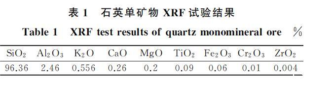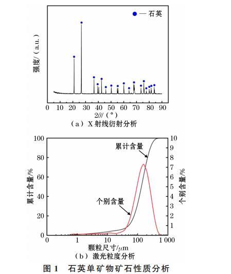 本試驗所用的單礦物石英取自某礦廠,將制備后的石英單礦物樣品進行X射線衍射(XRD)分析、X射線熒光光譜(XRF)分析和激光粒度分析,XRD的分析結(jié)果如圖1(a)所示,XRF的分析結(jié)果見表1,粒度分析如圖1(b)所示。從圖1(a)可以看出,石英單礦物SiO?峰強度以及密度最高,說明SiO?占主導(dǎo)地位。從圖1(b)可以看出,樣品的中值粒徑D??達到了133.5μm,D??則達到了264.3μm.綜合上述礦物的純度以及粒度,石英可滿足后續(xù)單礦物試驗以及機理分析的要求。