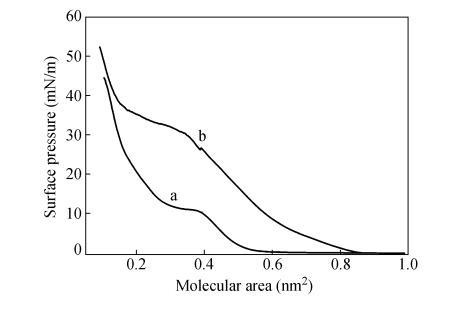 2種單體分子結(jié)構(gòu)相似,CO2DA比CODA多了一CH?-CH?O一柔性間隔基,整個分子的舒展程度相對較大。當(dāng)CODA分子在水面鋪展時,與水分子的相互作用小,分子"平躺"在水面上,當(dāng)膜障壓縮單分子膜時,CODA分子受到側(cè)向壓力時容易發(fā)生滑移,形成多層膜。而CO2DA分子端基親水性相對較強,當(dāng)膜障壓縮單分子膜時分子在水面能立起來,并與液面形成一定的夾角。因此CO2DA單分子膜占據(jù)面積較大,崩潰壓較高。
