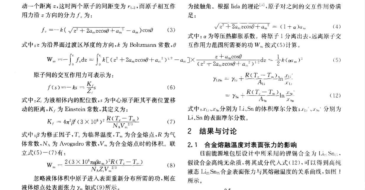核能是公認現實可行的、可大規模替代常規能源的清潔能源。聚變堆或聚變_裂變混合堆液態金屬包層因其固有特性和優勢,在國際上被普遍認為是未來電站最具發展潛力的包層設計方案之一。作為包層氚增殖劑和冷卻劑的鋰錫合金與鋰鉛合金一樣,具有廣闊的發展前景,其制備、純化、質量輸運等工藝難題正逐步得到重視。液態金屬的表面張力不僅是認識和理解冶煉過程最基本的物理量之一,而且是氣體吸收、氣泡形核、雜質生長等界面現象的控制因素。目前對液態金屬表面張力的研究多集中于金屬單質,合金的表面或界面行為在理論或實驗上都相當不足,主要是由于精確確定表面張力十分困難[2]。針對液態鋰錫合金這種新型的核材料,從基礎研究方面看,目前還沒有一種實驗方法能確定液體界面的結構,即兩個相之間過渡區域的結構,因此需要有一些假設或模型來滿足表面張力理論的研究。