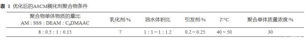 聚合單體的摩爾比、單體總質量百分比、油水體積比等會影響到聚合的耐鹽、增黏、乳液穩定性等性能指標和應用效果,通過優化合成條件,有助于獲得性能優異的ASCM聚合。
