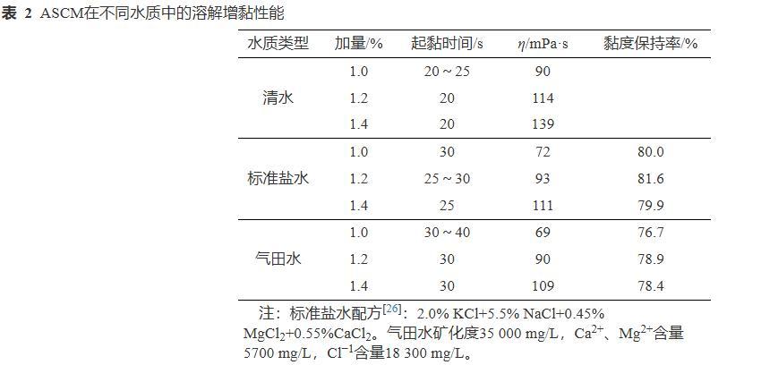 分別用清水、蘇里格氣田水、標準鹽水配制不同濃度的ASCM水溶液,測試起黏時間和3 min后的溶液黏度,溶解增黏性能,結果如表2所示。