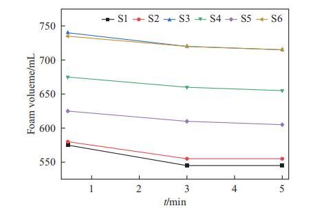 表面活性劑復合物的發泡性能評估如圖3所示。通常,SMCT體系顯示出比SLES體系更好的泡沫性能(S4 vs S1,S5 vs S2,S3≈S6)。以30秒時的泡沫體積為例。對于SLES體系(S1-S3),二元體系S1和三元體系S2(含DG)的泡沫體積相似,約為575 mL,而S3(含海藻糖脂)的泡沫體積約為740 mL。對于SMCT體系,二元體系S4的泡沫體積約為675 mL,加入DG(S5)后降至625 mL,但加入海藻糖脂(S6)后增加至約740 mL。這表明在二元SLES或SMCT體系中加入DG并未增強發泡性能。然而,在含有海藻糖脂作為輔助表面活性劑的復合物S3和S6中觀察到了協同效應。這種增強的發泡效果可能歸因于在SLES和SMCT體系中加入海藻糖脂后表面張力的降低。