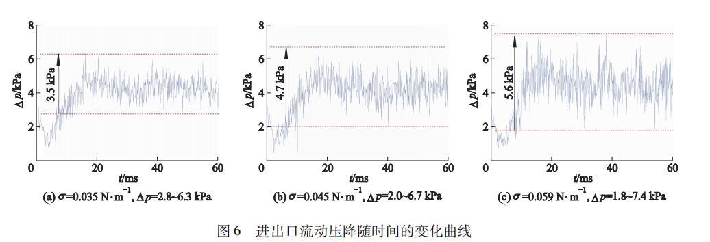 圖6進(jìn)出口流動(dòng)壓降隨時(shí)間的變化曲線