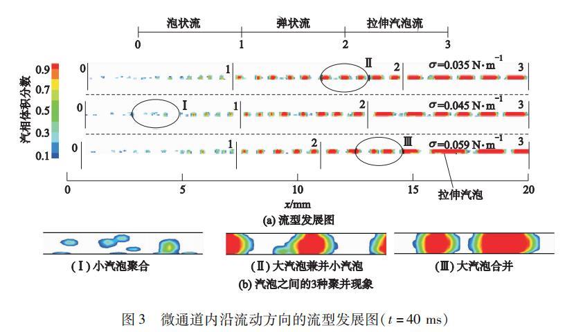 首先從汽泡在微通道的演變與流型發(fā)展的特征入手,討論不同表面張力下,矩形微通道內(nèi)沿流動(dòng)方向的汽液兩相分布變化的差異。圖3a給出了σ分別為0.035,0.045,0.059 N·m?1時(shí)各自的汽泡演變與流型發(fā)展的計(jì)算云圖(t=40 ms),圖3b為汽泡脫離壁面后的3種不同的聚并現(xiàn)象,I,II,III分別對(duì)應(yīng)于剛脫離加熱壁面的小汽泡之間的聚并、較大尺寸汽泡與壁面上尚未脫離或剛脫離的小汽泡之間的聚并、尺寸相當(dāng)?shù)钠麖椈蚶炱葜g的聚并。