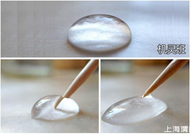 引申實驗,在水滴上放置1滴油,把它們混合在一起后,再用干凈的牙簽戳混合后的液滴,看看此時會發(fā)生什么現(xiàn)象。然后用蘸有洗潔精的牙簽戳混合后的液滴,看看又會出現(xiàn)什么現(xiàn)象。