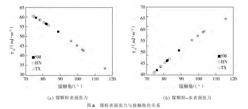 2)隨著變質(zhì)程度的增加,煤顆粒的表面張力減?。浑S著煤顆粒粒度的減小,不同變質(zhì)程度煤樣的表面張力與接觸角呈負(fù)相關(guān),煤-水界面張力與接觸角呈正相關(guān);接觸角增大,煤顆粒表面張力減小,煤-水界面張力增大。