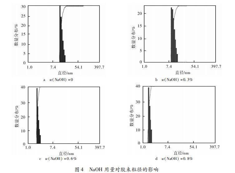 以去離子水配制不同NaOH含量的質(zhì)量分數(shù)為0.3%的HABS溶液,利用動態(tài)光散射技術(shù)考察NaOH對HABS溶液膠束大小的影響,結(jié)果如圖4所示。
