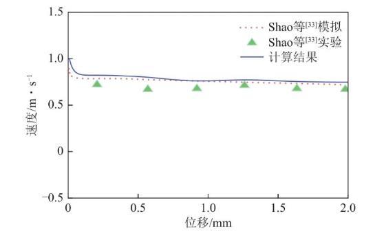 圖4 顆粒速度-位移曲線的實(shí)驗(yàn)與模擬結(jié)果