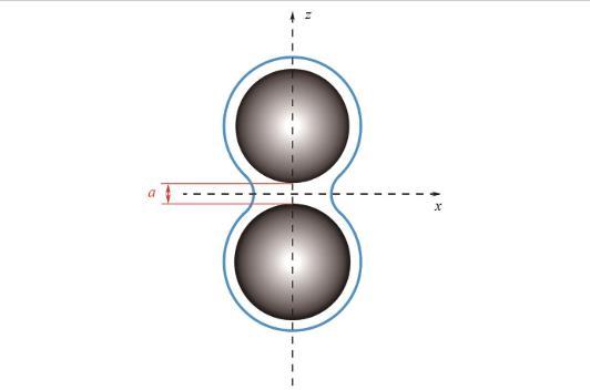 圖3說明了兩個(gè)相同球形顆粒之間的液橋結(jié)構(gòu),液橋力是由于顆粒間存在液體橋而產(chǎn)生的吸引力,主要由毛細(xì)力和表面張力組成。毛細(xì)力包括液橋內(nèi)外的壓力差和液體表面張力在接觸角處產(chǎn)生的吸引力,而表面張力在液橋表面產(chǎn)生環(huán)向力,將顆粒拉近。液橋高度用兩顆粒之間的分離距離a(μm)表示。