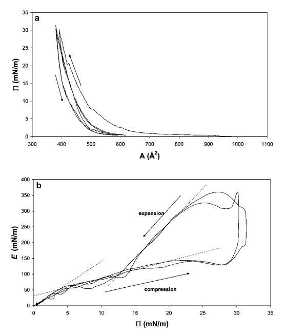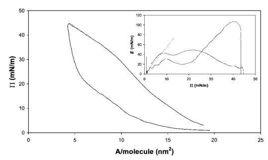 藜蘆皂甙。奎拉葉皂苷的壓縮曲線如圖6所示。該皂甙在拐點(diǎn)處顯示出非常高的表面壓力,最大表面壓力為45 mN m-1。此外,皂甙表現(xiàn)出很寬的遲滯回線。從E–P曲線推斷出斜率為4.3,觀察到E中出現(xiàn)2個(gè)平滑的峰,這可能表明界面中存在相變,從皂甙的相對(duì)拉長(zhǎng)的疏水區(qū)域判斷。27當(dāng)屏障方向逆轉(zhuǎn)時(shí),觀察到E中存在較大的超調(diào),表明膜破裂,類(lèi)似于HFBII。